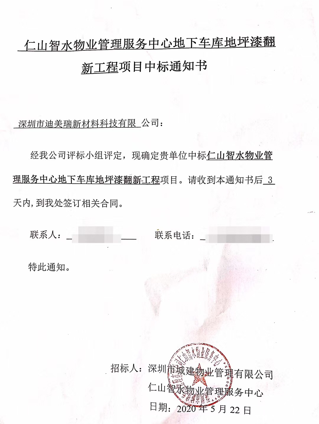 深圳市龍華仁山智水地下車庫翻新項目,5月22日,我司一舉拿下仁山智水物業(yè)小區(qū)地下車庫地坪翻新項目中標通知書。中標當天,迪美瑞投入地下車庫地坪翻新項目中,為了更好的建設小區(qū)業(yè)主的美好生活,項目施工時間僅用了一天的時間清理現場,安排好施工人員進場施工。貼封條、封鎖施工現場,提醒業(yè)主繞路而行。迪美瑞施工人員百分百的投入工作狀態(tài)。
