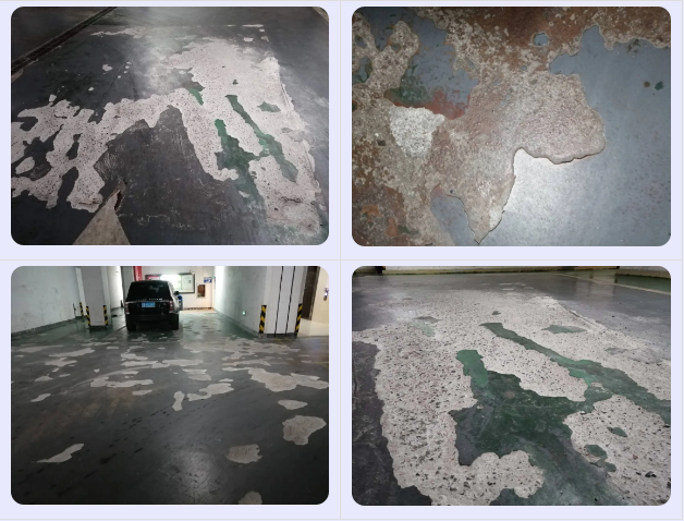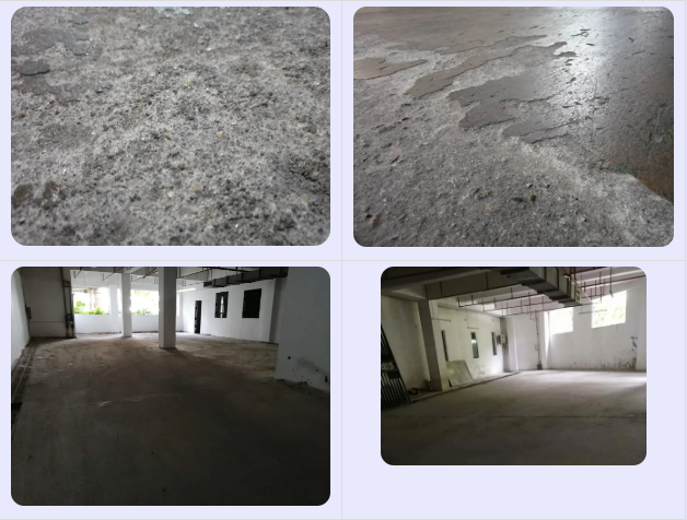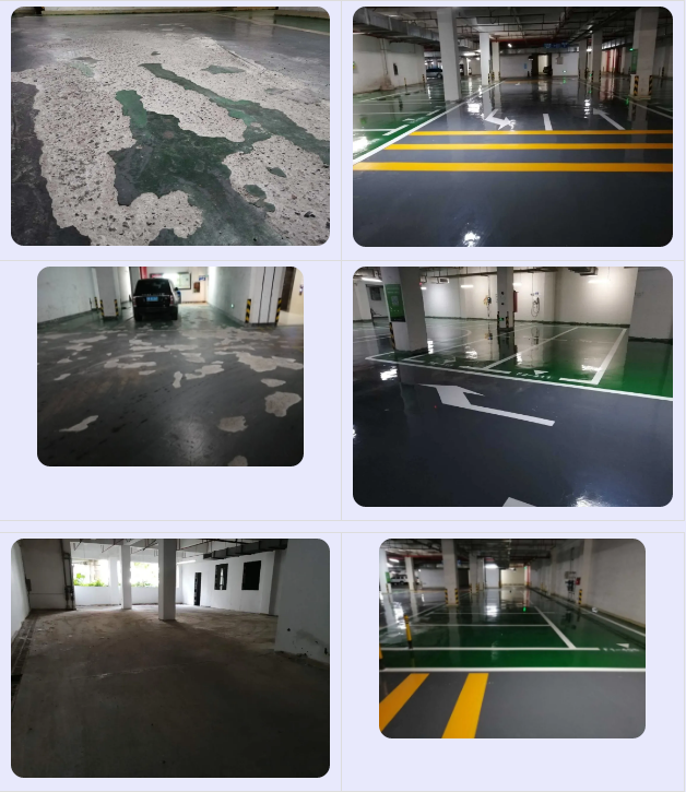 地面嚴重破損,爛地面較多,地面主要問題:起皮、脫層、松散地面。前期需要把爛地面修補好,舊油漆清除干凈,地面整體的打磨一遍。